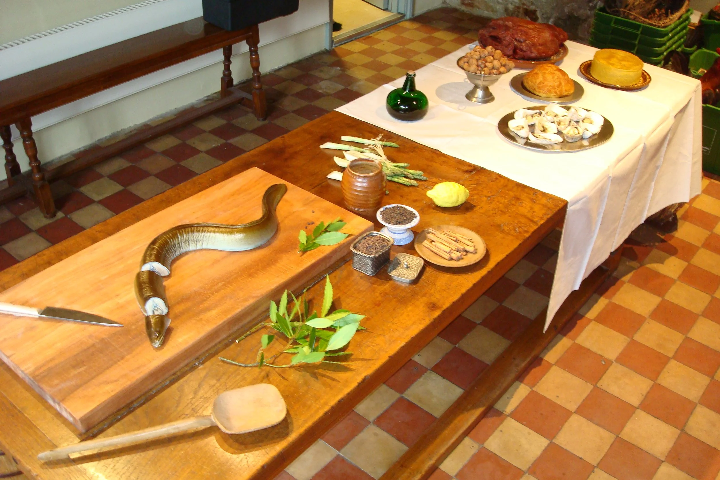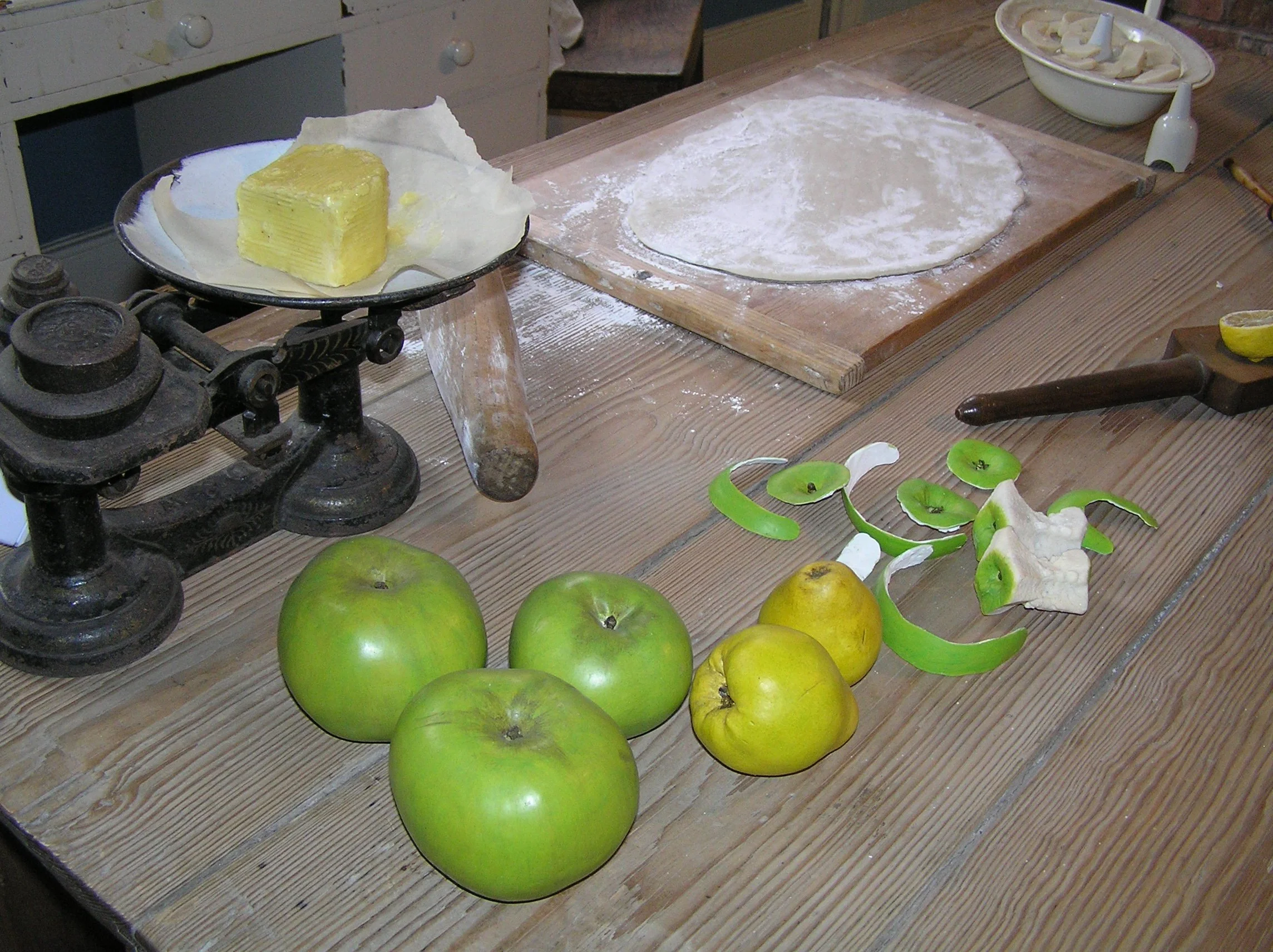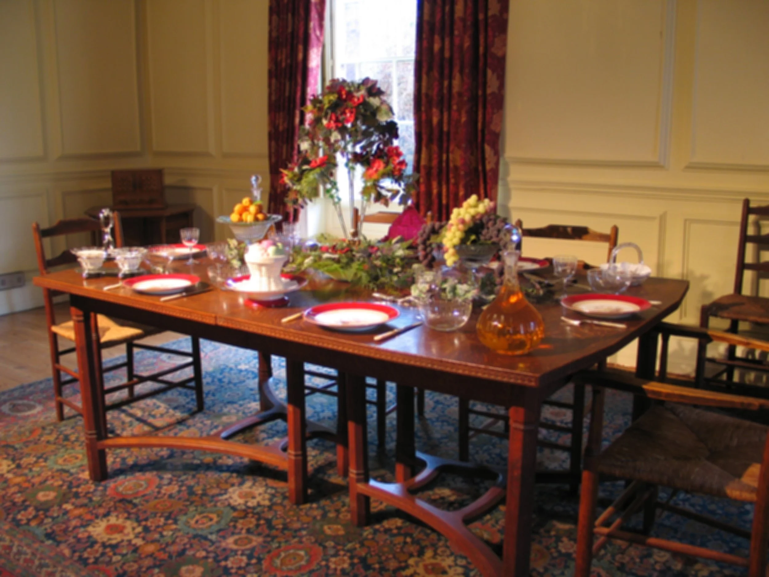 The objective was to show a table set for the last course of a dinner or six people in August c.1900. The Museum wanted to display the original dining room furniture by Edward Gimson that they had in their collection so it was decided to omit a white linen tablecloth. August was chosen as a popular month for visitors to the Hall and to enable replica food to be created using apples, quinces and mulberries which would have been available on the Belgrave Estate at this time.