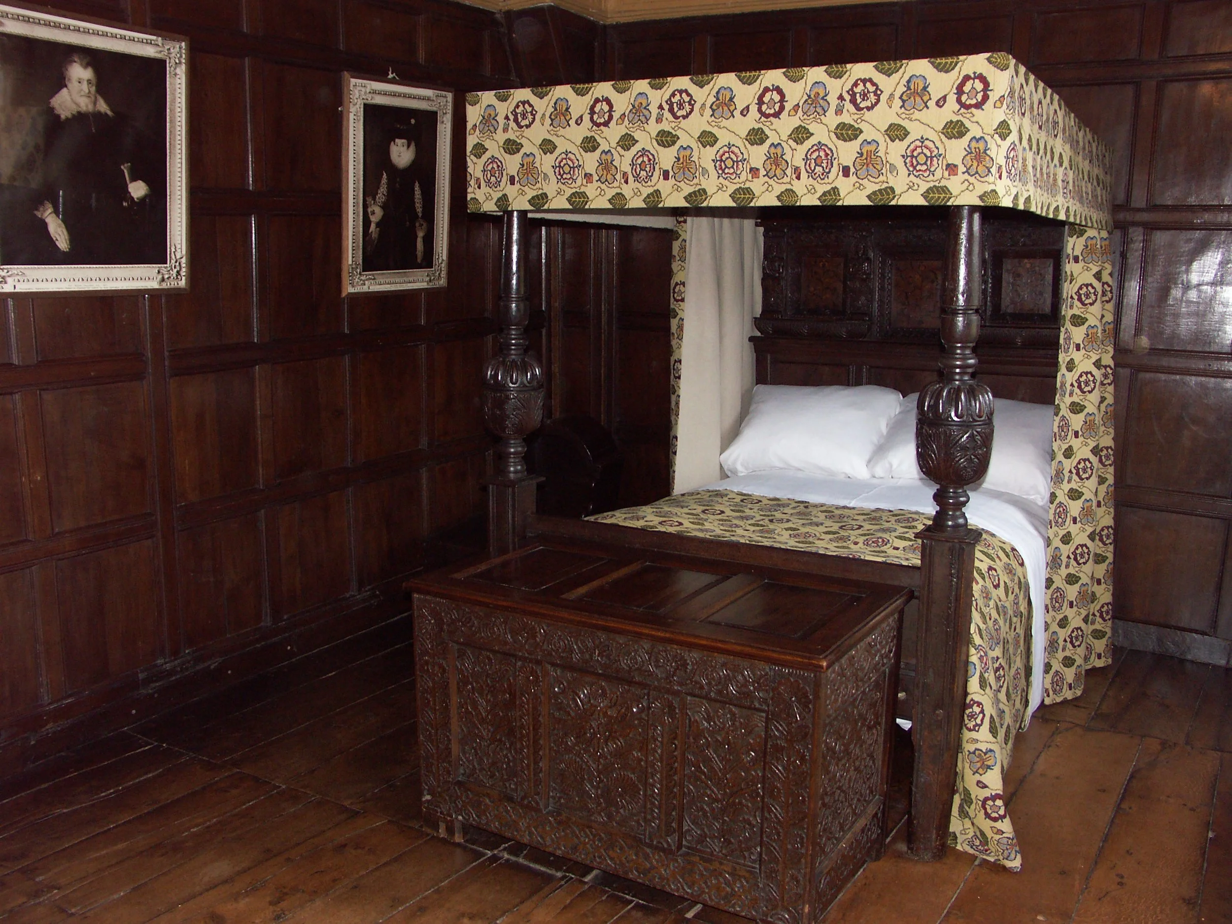 Original bed linen and replica textiles and iron work for bed at Bramhall Hall